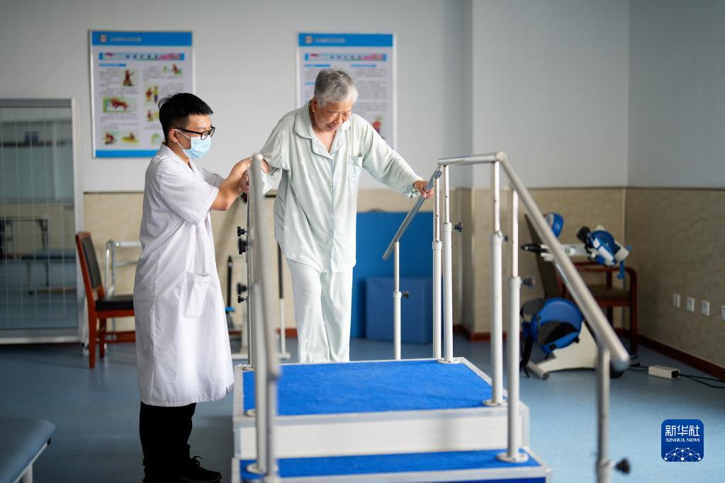 5月19日,河北省灤南縣一家養老機構的工作人員在指導老人進(jìn)行康復訓練。