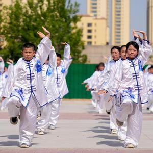 5月19日,河北省灤南縣第三實(shí)驗小學(xué)學(xué)生在操場(chǎng)上練習武術(shù)。