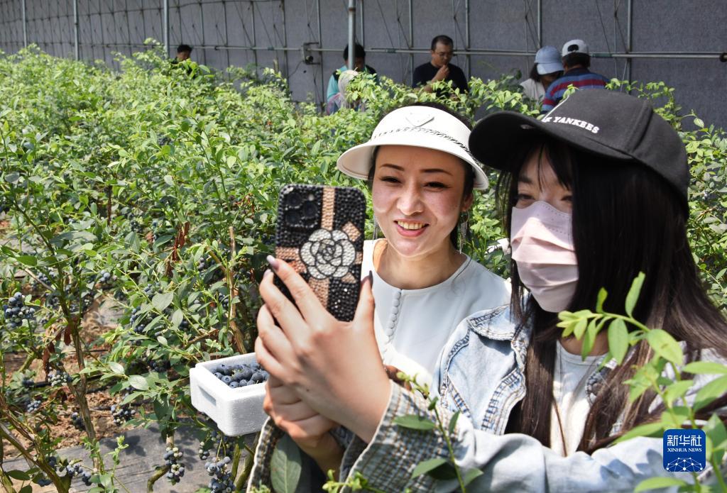 5月19日,游客在寶山鎮一家藍莓專(zhuān)業(yè)合作社藍莓采摘大棚內拍攝。