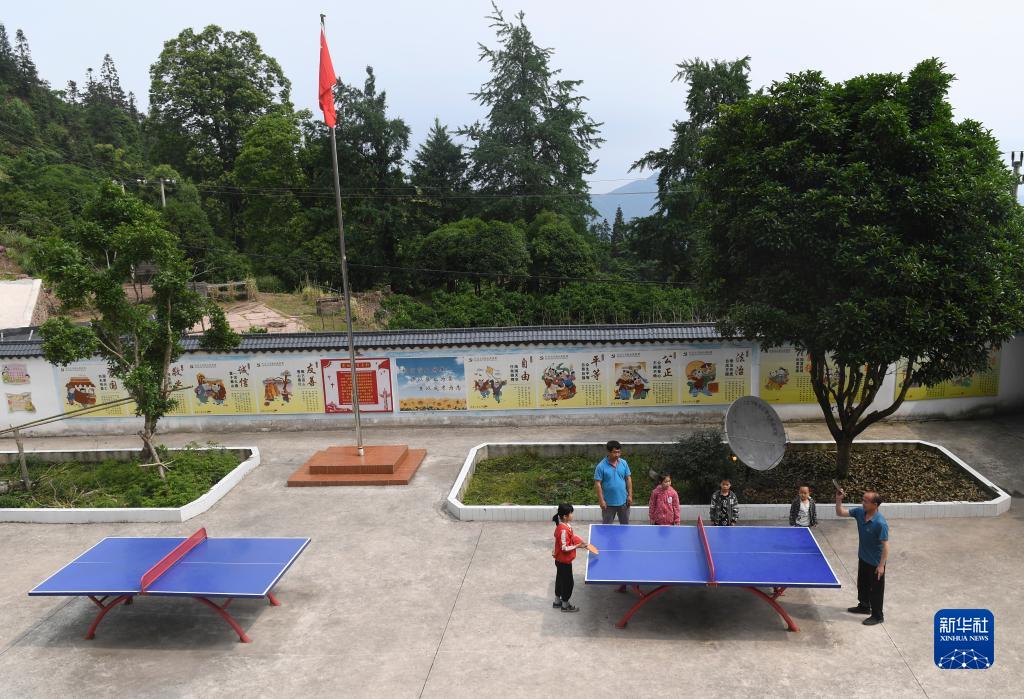 5月19日,在廣西靈川縣大境瑤族鄉金竹教學(xué)點(diǎn),學(xué)校老師和學(xué)生一起打乒乓球。