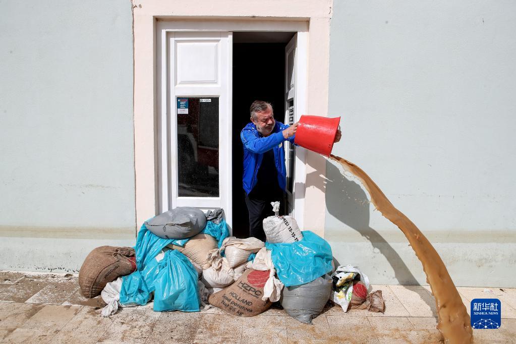 5月16日,在克羅地亞奧布羅瓦茨,一名男子清理進(jìn)水的房屋。