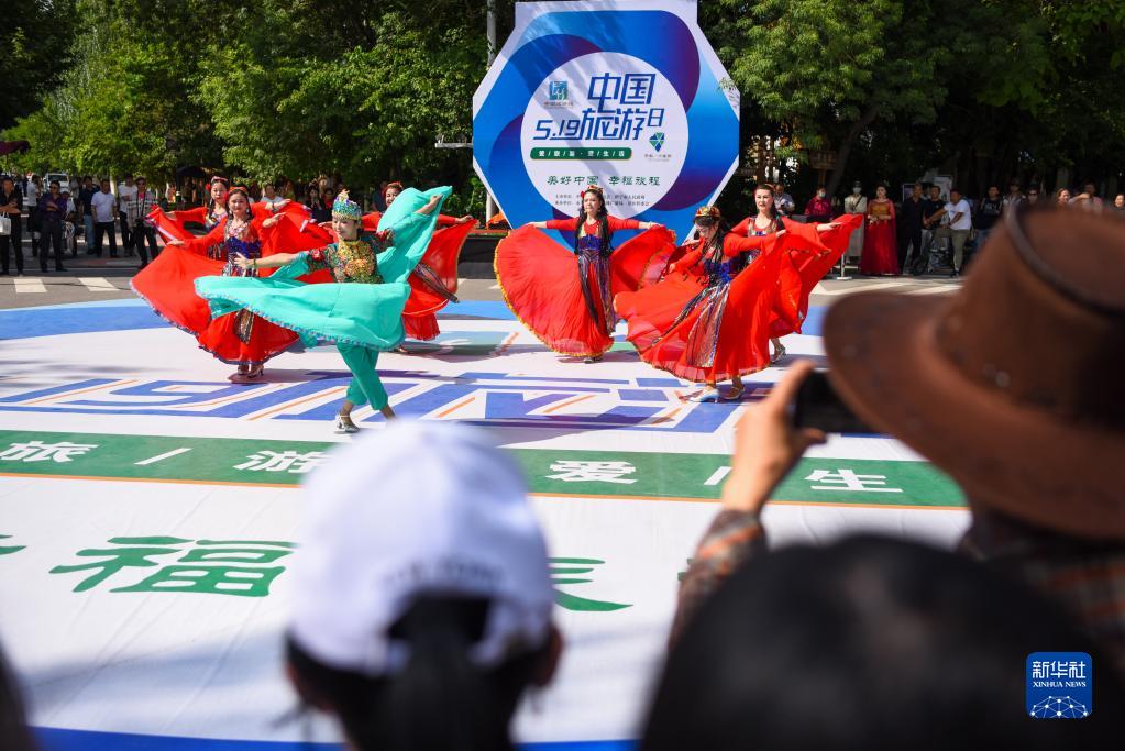 在伊寧市六星街,游客欣賞舞蹈表演(5月19日攝)。