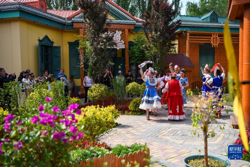 在伊寧市六星街,當地居民跳起舞蹈歡迎遠方來(lái)客(5月19日攝)。