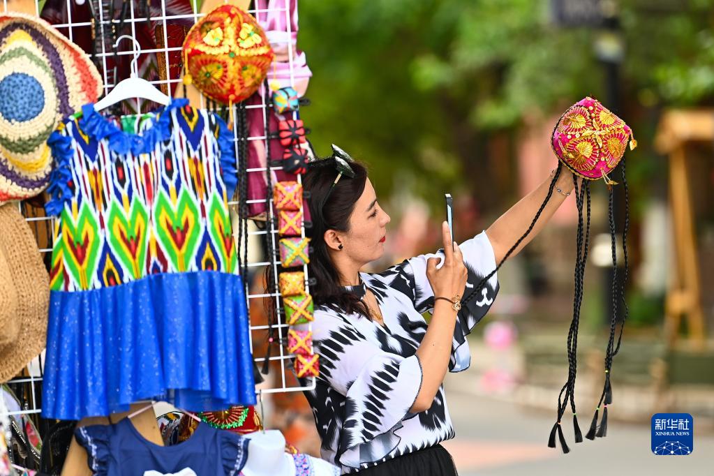 游客在伊寧市六星街拍攝特色小花帽(5月19日攝)。
