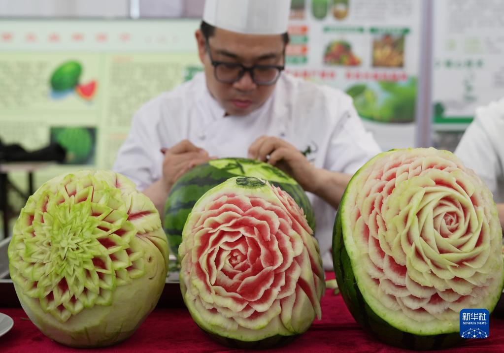 5月20日,一位廚師在展示西瓜雕刻技藝。