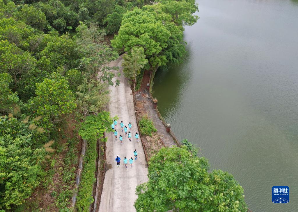 在海南瓊中縣舉辦的中國足協(xié)女足青訓中心“希望杯”U12組比賽的空閑時(shí)段,四川隊隊員在賓館內部道路跑步(無(wú)人機照片,4月10日攝)。