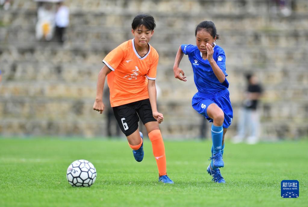 在海南瓊中縣舉辦的中國足協(xié)女足青訓中心“希望杯”U12組四川隊對陣廣東隊的比賽中,來(lái)自涼山彝族自治州的四川隊球員舍布么扯鳩莫(右)奮力拼搶?zhuān)?月10日攝)。