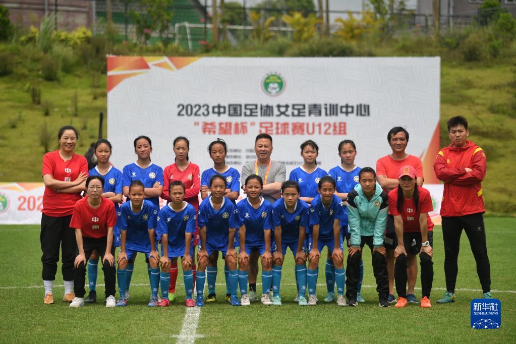在海南瓊中縣舉辦的中國足協(xié)女足青訓中心“希望杯”U12組四川隊對陣廣東隊的比賽后,四川隊成員在球場(chǎng)合影(4月10日攝)。