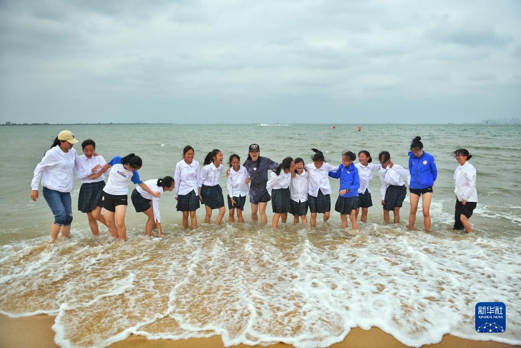 在海南瓊中縣舉辦的中國足協(xié)女足青訓中心“希望杯”U12組比賽結束后,四川隊教練團隊帶領(lǐng)隊員在海邊游玩(4月11日攝)。