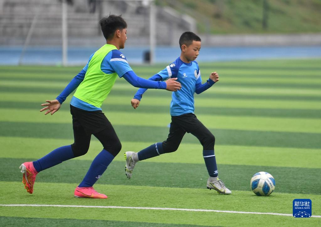 在瀘州天立春雨學(xué)校足球場(chǎng),來(lái)自涼山彝族自治州的金貴坤(右)與隊友進(jìn)行訓練(3月28日攝)。