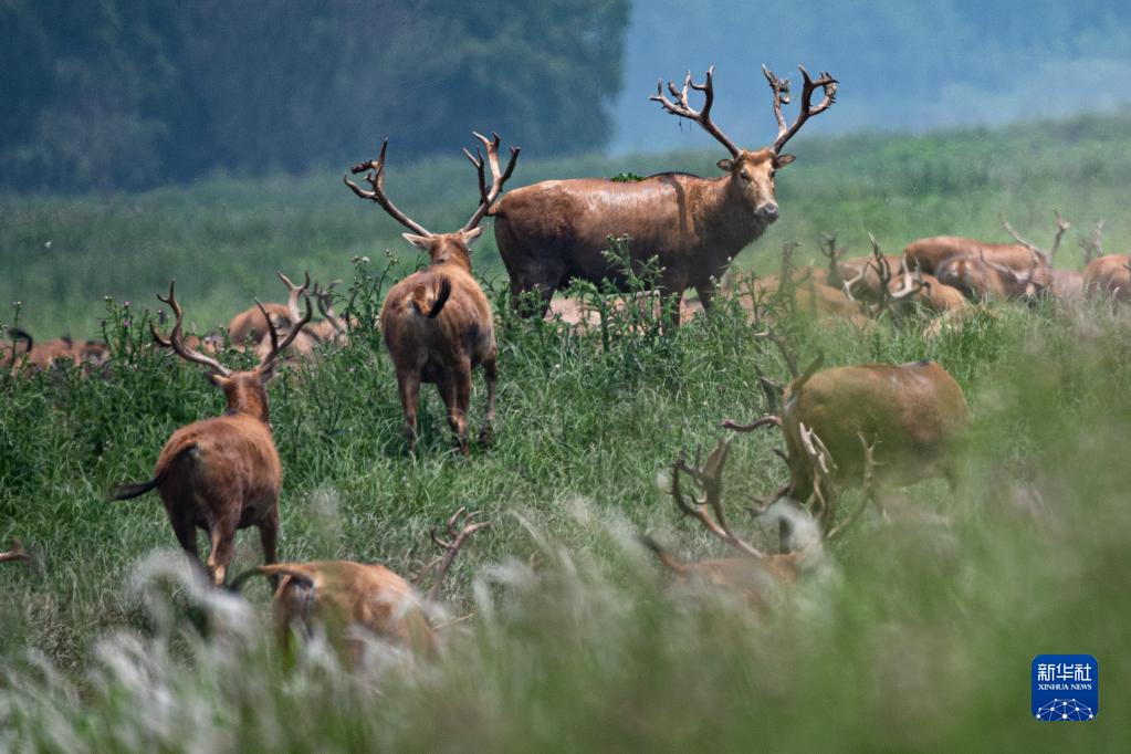 5月19日,一群麋鹿在湖北石首麋鹿國家級自然保護區內活動(dòng)。