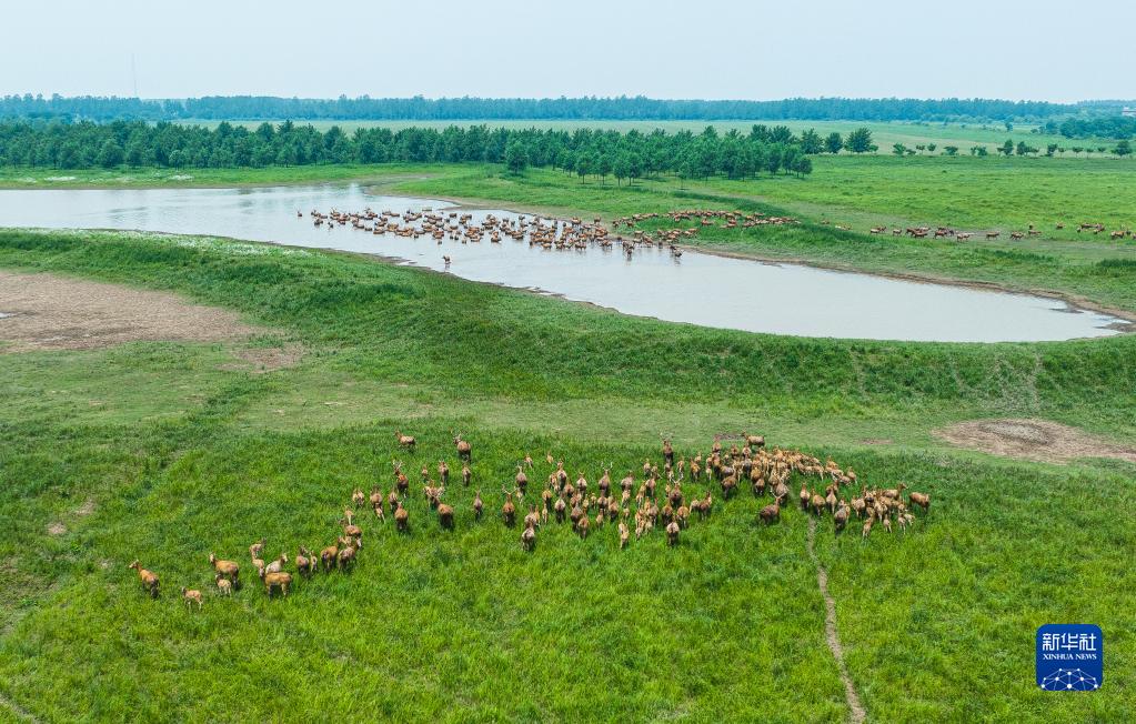 5月19日,一群麋鹿在湖北石首麋鹿國家級自然保護區內活動(dòng)(無(wú)人機照片)。