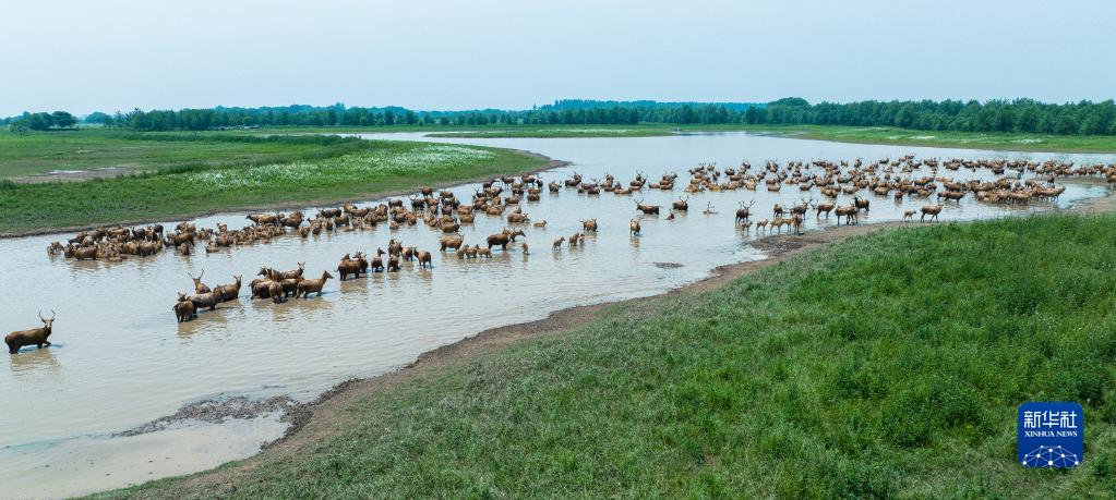 5月19日,一群麋鹿在湖北石首麋鹿國家級自然保護區內活動(dòng)(無(wú)人機照片)。
