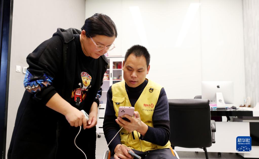 劉瑩在創(chuàng )業(yè)導師柯水昌(右)的辦公室內用手機打字的方式跟他交流討論(4月14日攝)。