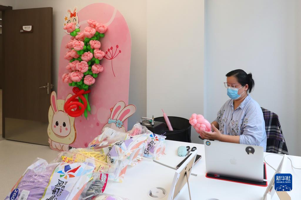 5月20日,劉瑩在剛啟用的上海市殘疾人就業(yè)服務(wù)中心“陽(yáng)光201”殘疾人就業(yè)服務(wù)綜合平臺新大樓的工作室中制作魔術(shù)氣球。