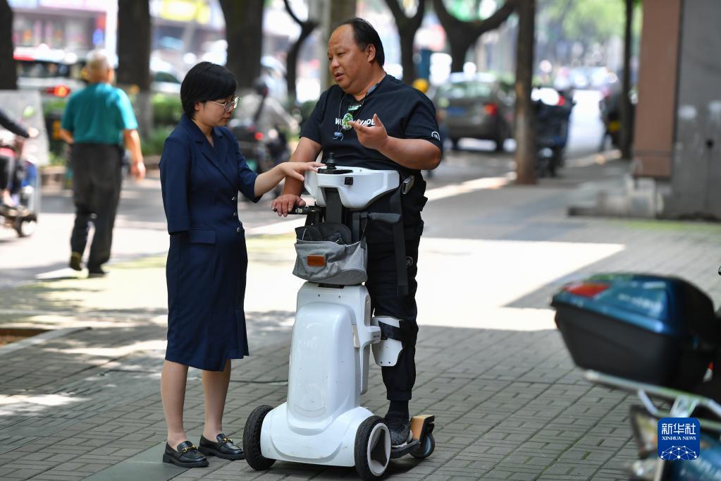 在湘潭市雨湖區廣場(chǎng)街道韶山路社區,扶婷(左)向一名殘友了解康復和輔助行動(dòng)器械的使用情況(5月18日攝)。