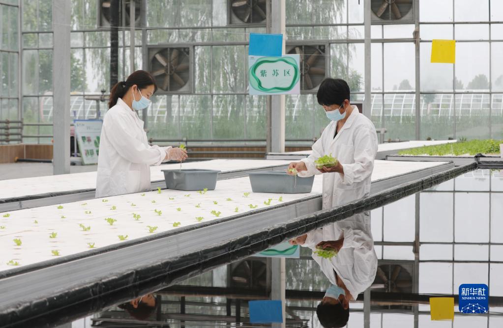5月20日,河北省保定市徐水區一家現代農業(yè)示范園區的工作人員在智能溫室內定植水培蔬菜幼苗。