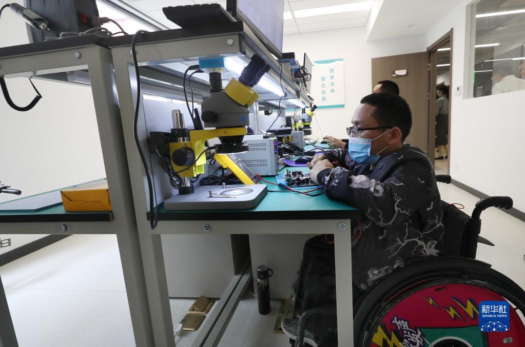 5月20日,在“陽(yáng)光201”平臺電子科創(chuàng )工作室內,一位工作人員在進(jìn)行電子元件修理的展示。