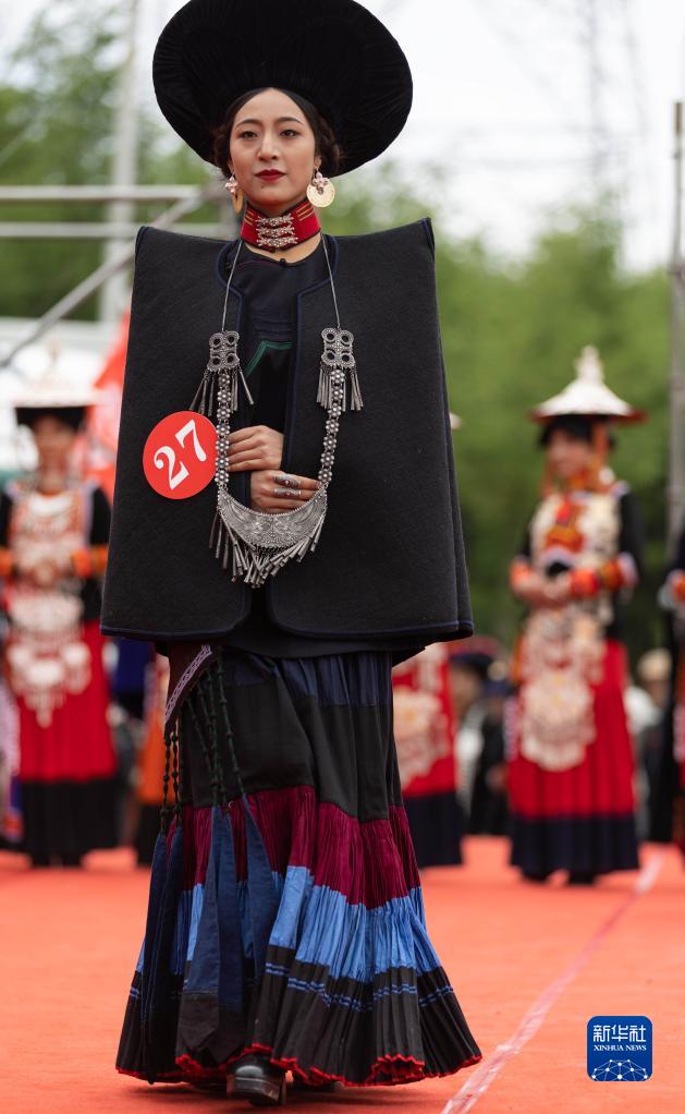 5月20日,彝族姑娘吉俄石普在展示傳統服飾,她獲得“金索瑪”獎。