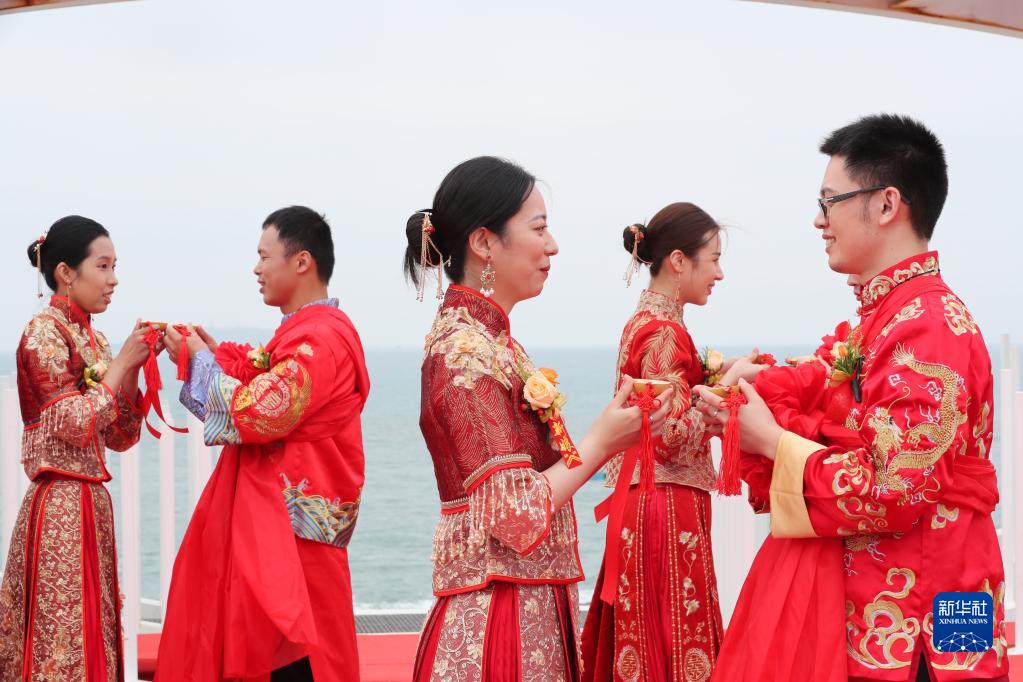 當日,一場(chǎng)以“愛(ài)情恒久遠、幸福長(cháng)相伴”為主題的閩臺“山盟海誓”集體婚禮暨2023年閩臺婚姻家庭交流活動(dòng)在福建省福州市平潭縣舉辦。21對閩臺新人身穿紅色中式婚服,手牽紅繡球,行跨火盆、踩瓦片、扎繡球和“合茶”、“合巹”、“海誓”等閩臺傳統結婚禮儀,結下跨越海峽的姻緣。