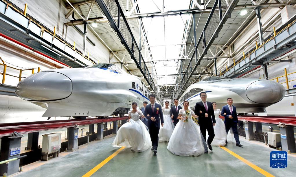 5月20日,新人們以休整中的動(dòng)車(chē)組列車(chē)為背景拍攝婚紗照。