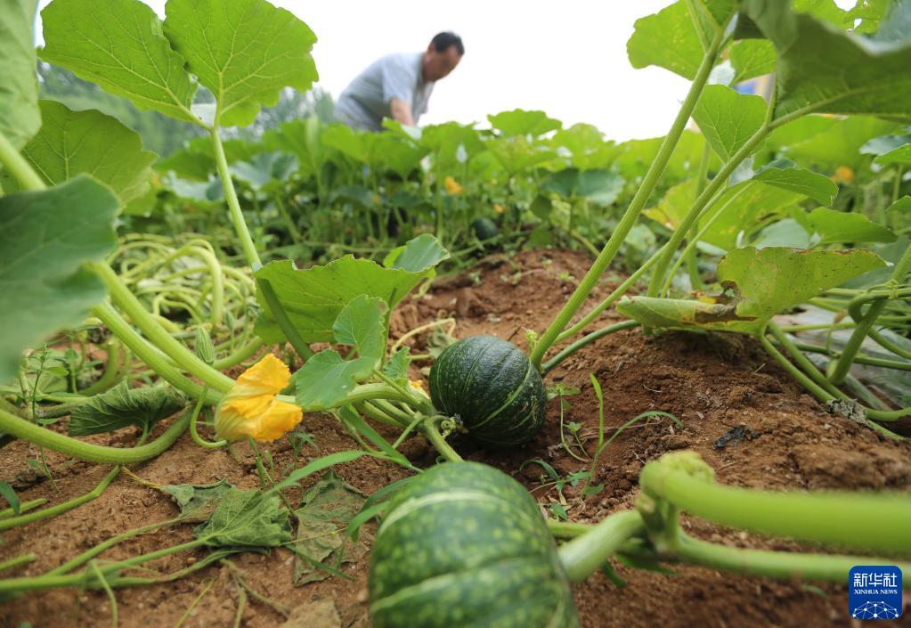 5月20日,在山東省臨沂市沂南縣岸堤鎮塘子村,農民在田間管護南瓜。