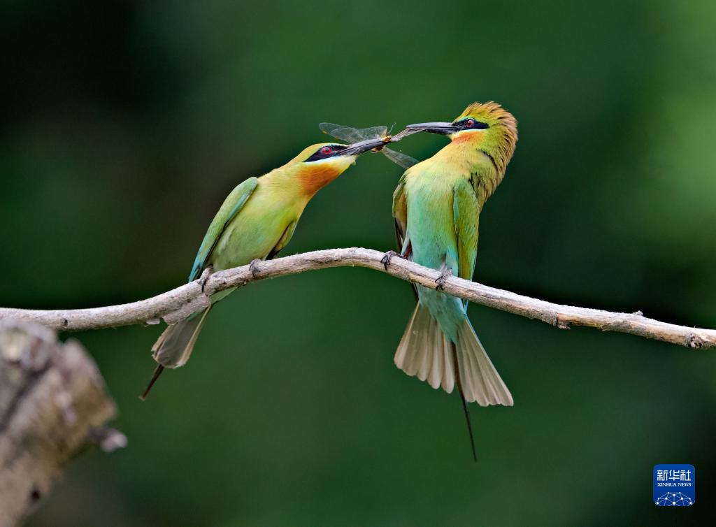 5月20日,雄鳥(niǎo)(右)在給雌鳥(niǎo)喂飼昆蟲(chóng)。