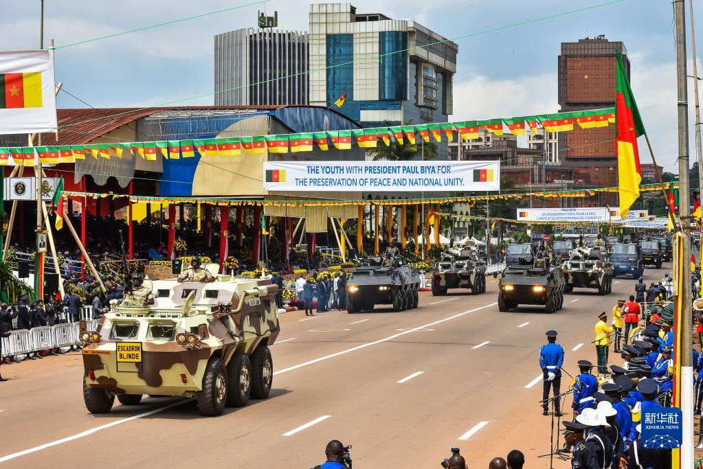 5月20日,在喀麥隆首都雅溫得舉行的國慶慶?;顒?dòng)上,裝甲車(chē)輛列隊行進(jìn)。