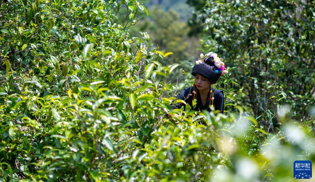 這是2023年5月17日,中國云南省勐??h布朗山布朗族鄉老曼峨寨的茶農在采茶。