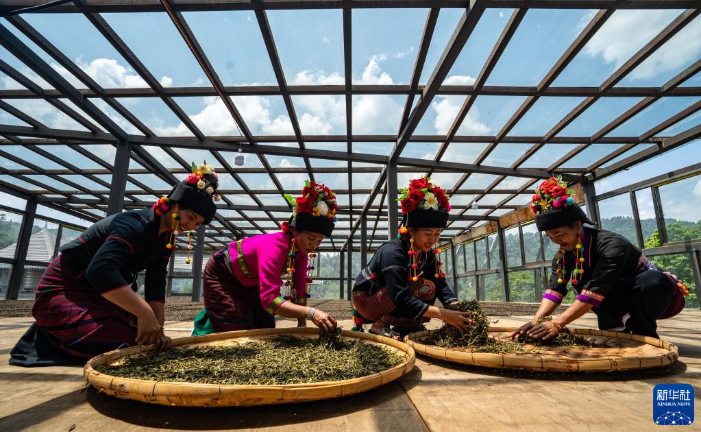 這是2023年5月17日,中國云南省勐??h布朗山布朗族鄉的茶農在晾曬茶葉。