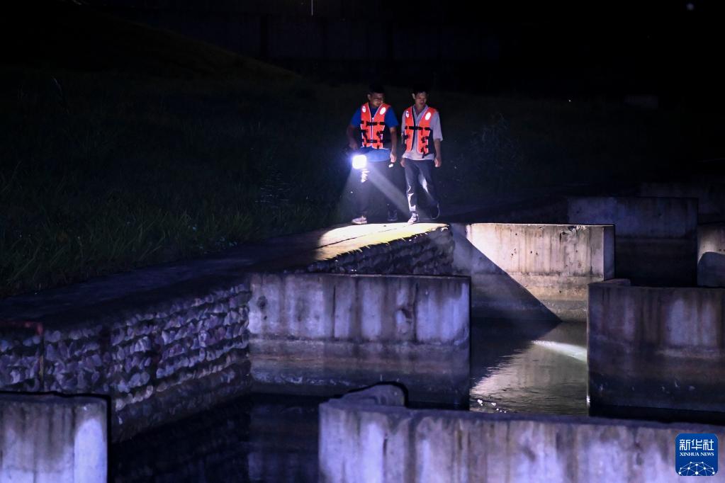 5月20日,技術(shù)人員對廣西大藤峽水利樞紐工程南木江副壩仿自然生態(tài)魚(yú)道進(jìn)行夜間監測作業(yè)。