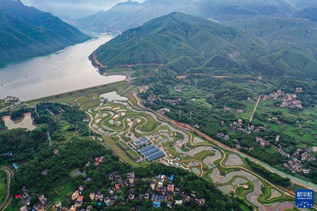 這是5月20日拍攝的廣西大藤峽水利樞紐工程南木江副壩仿自然生態(tài)魚(yú)道和上游峽谷(無(wú)人機照片)。