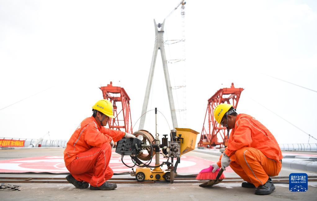 5月21日,工人在南中高速洪奇門(mén)特大橋對鋼箱梁進(jìn)行埋弧焊焊接。