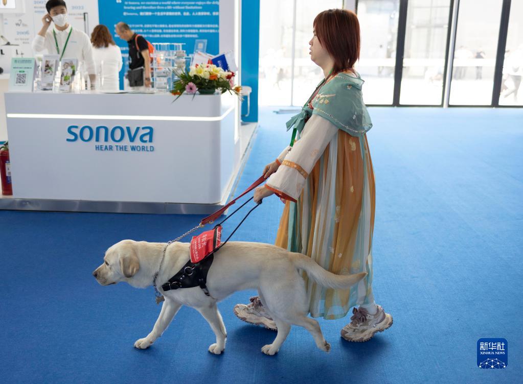 5月21日,在2023中國國際福祉博覽會(huì )上,一名視障女孩演示導盲犬如何帶領(lǐng)她走路。