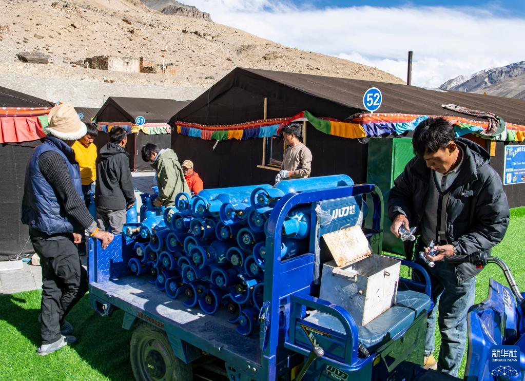 在珠峰游客大本營(yíng),工作人員將氧氣瓶送至帳篷旅館(5月13日攝)。新華社記者 孫非 攝