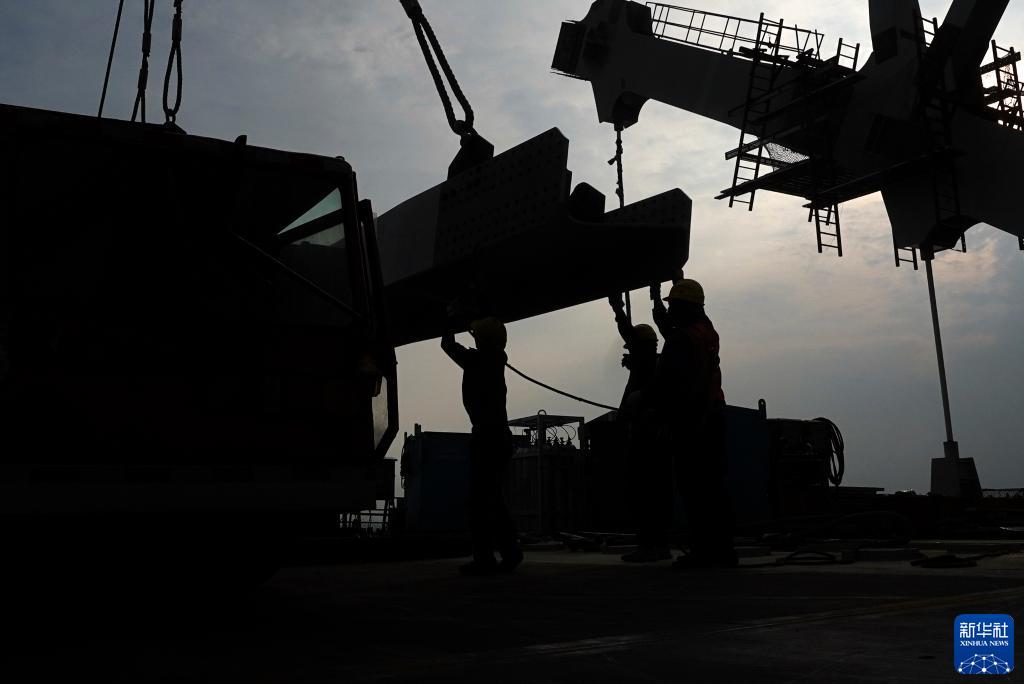 5月21日,在中鐵大橋局常泰長(cháng)江大橋錄安洲專(zhuān)用航道橋施工現場(chǎng),工人在卸鋼梁桿件。