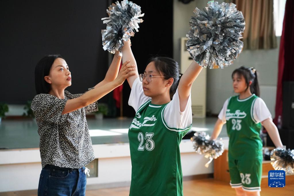在北京市健翔學(xué)校,廖茜(左一)指導舞蹈團的學(xué)生訓練(5月18日攝)。