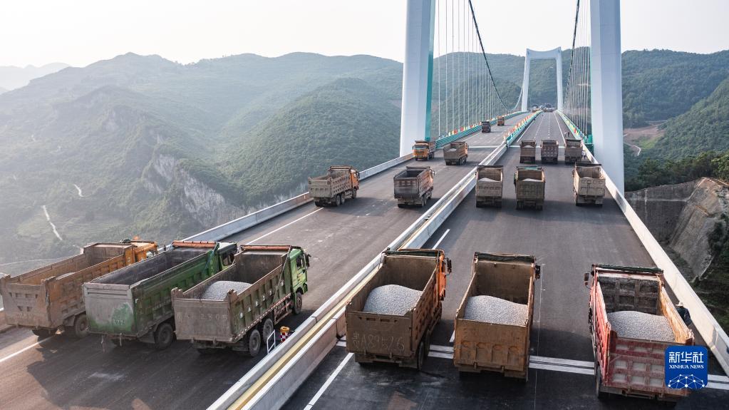 當日,由貴州路橋集團承建的金烽烏江大橋進(jìn)行靜態(tài)荷載試驗,48輛負載砂石的大型貨車(chē)有序行駛到固定的位置進(jìn)行對稱(chēng)、偏心檢測,檢驗橋梁結構整體的施工質(zhì)量與受力性能,為橋梁竣工驗收提供科學(xué)依據。
