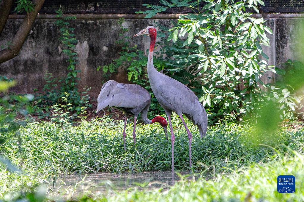 這是5月16日在泰國呵叻府動(dòng)物園赤頸鶴保育中心拍攝的赤頸鶴。
