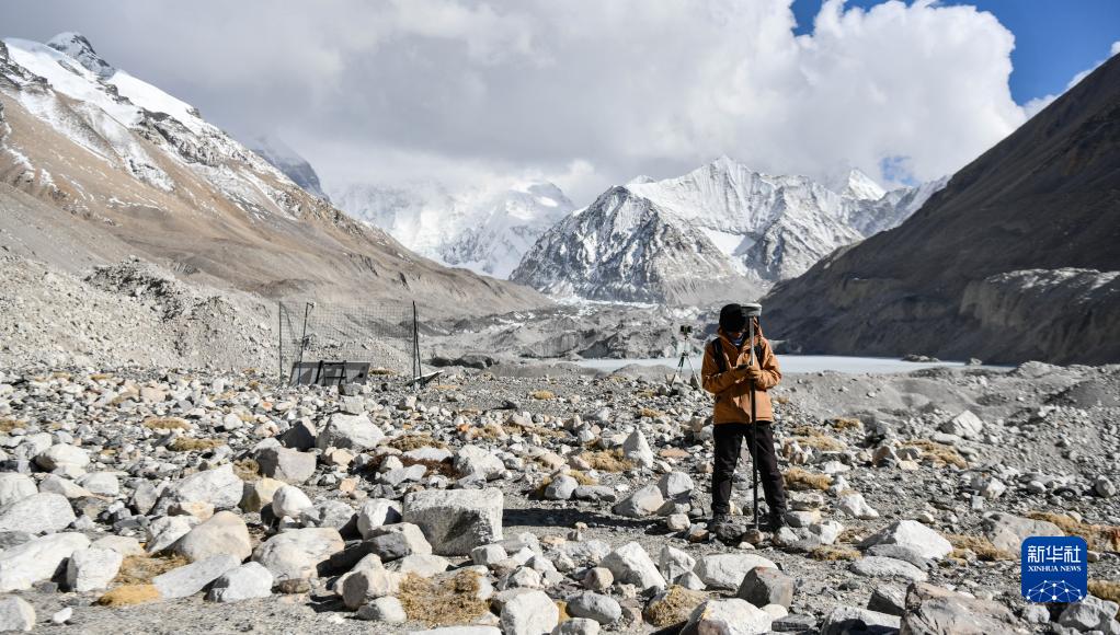 在珠峰登山大本營(yíng)附近,科考隊員對冰川進(jìn)行實(shí)時(shí)差分GPS定位(5月15日攝)。