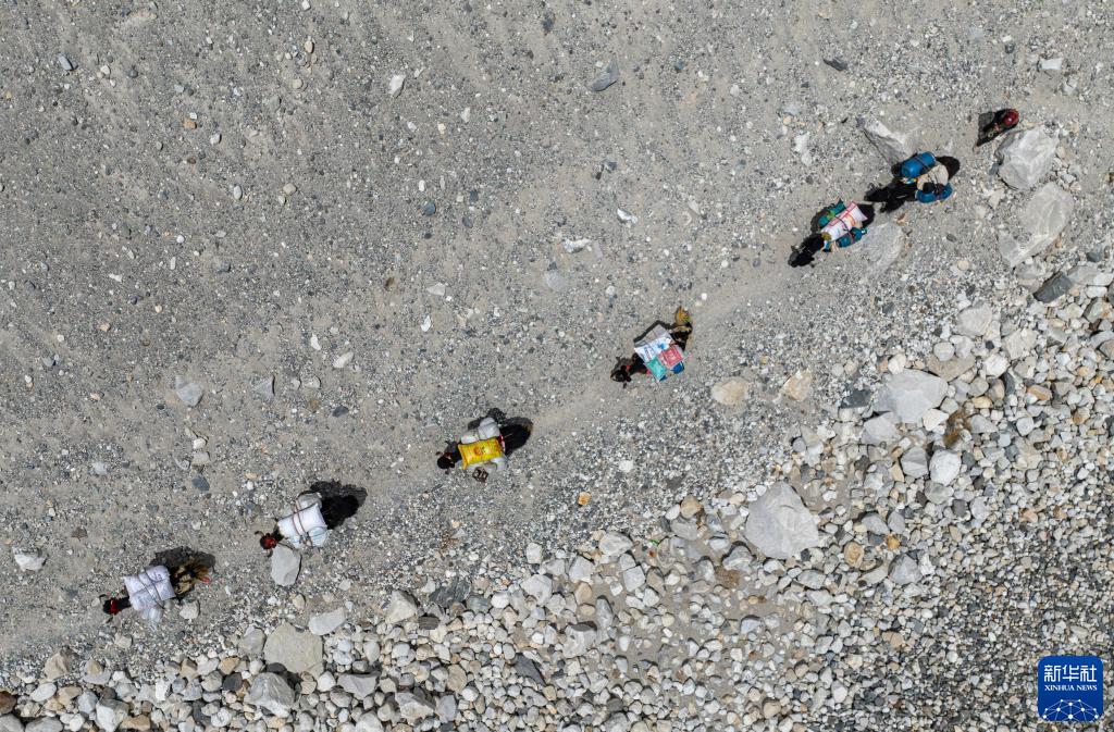 牦牛運輸隊向海拔6500米的珠峰前進(jìn)營(yíng)地進(jìn)發(fā)(5月18日攝,無(wú)人機照片)。