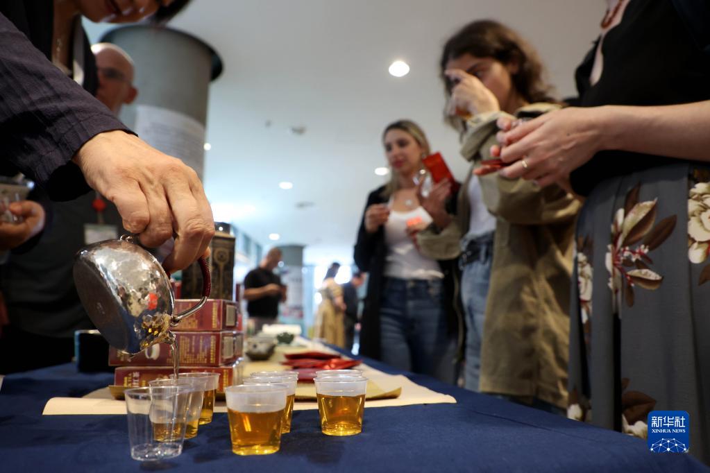 5月21日,人們在以色列特拉維夫中國文化中心“茶和天下·雅集——美在鄭州”推廣活動(dòng)上品茶。