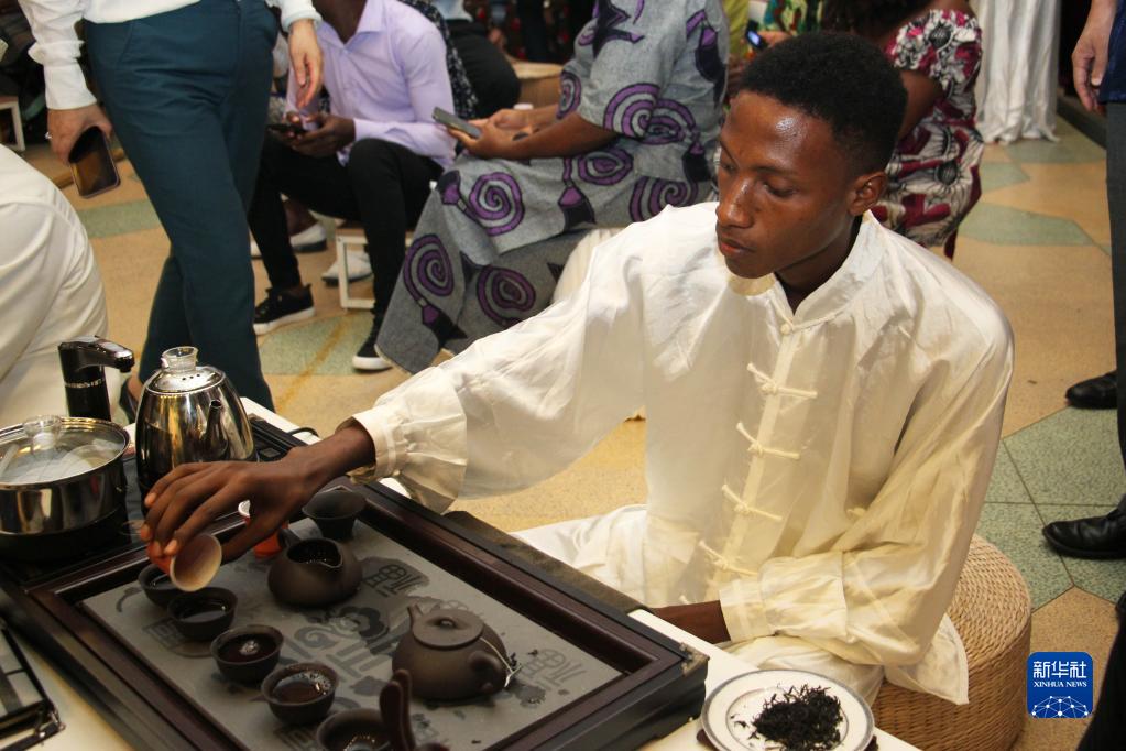5月20日,一名孔子學(xué)院的學(xué)生在貝寧科托努貝寧中國文化中心“茶和天下·雅集——青島有禮”文化交流活動(dòng)上備茶。