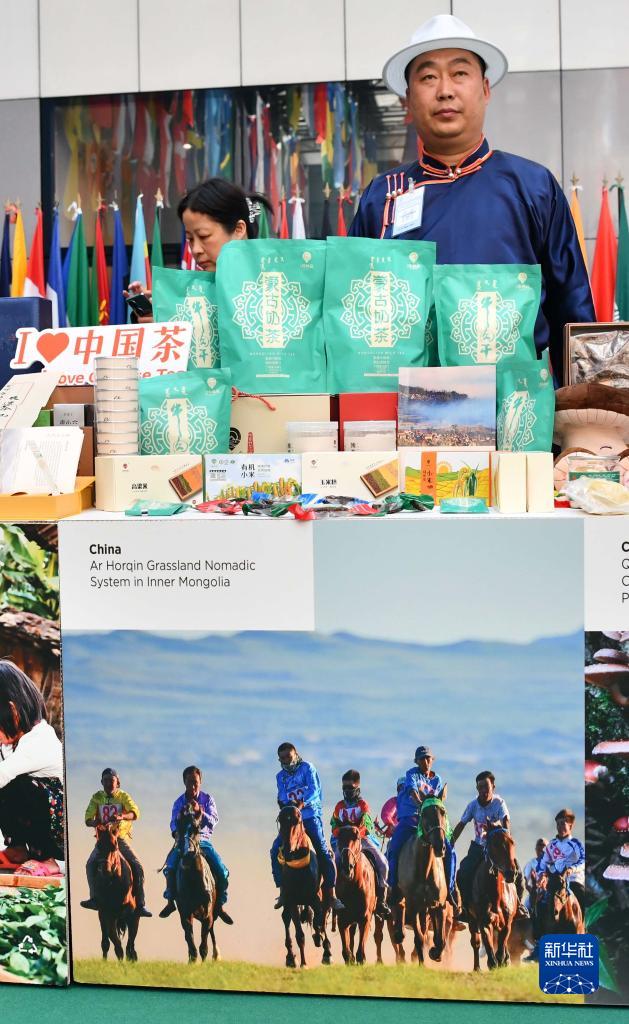 5月22日,在意大利羅馬的聯(lián)合國糧農組織總部,內蒙古阿魯科爾沁草原游牧系統的代表展示當地產(chǎn)品。