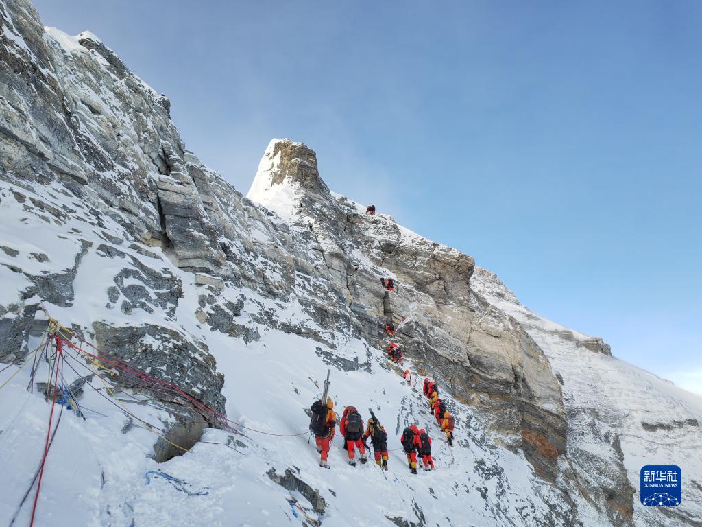 5月23日,2023年珠峰科考登頂隊員在沖頂。