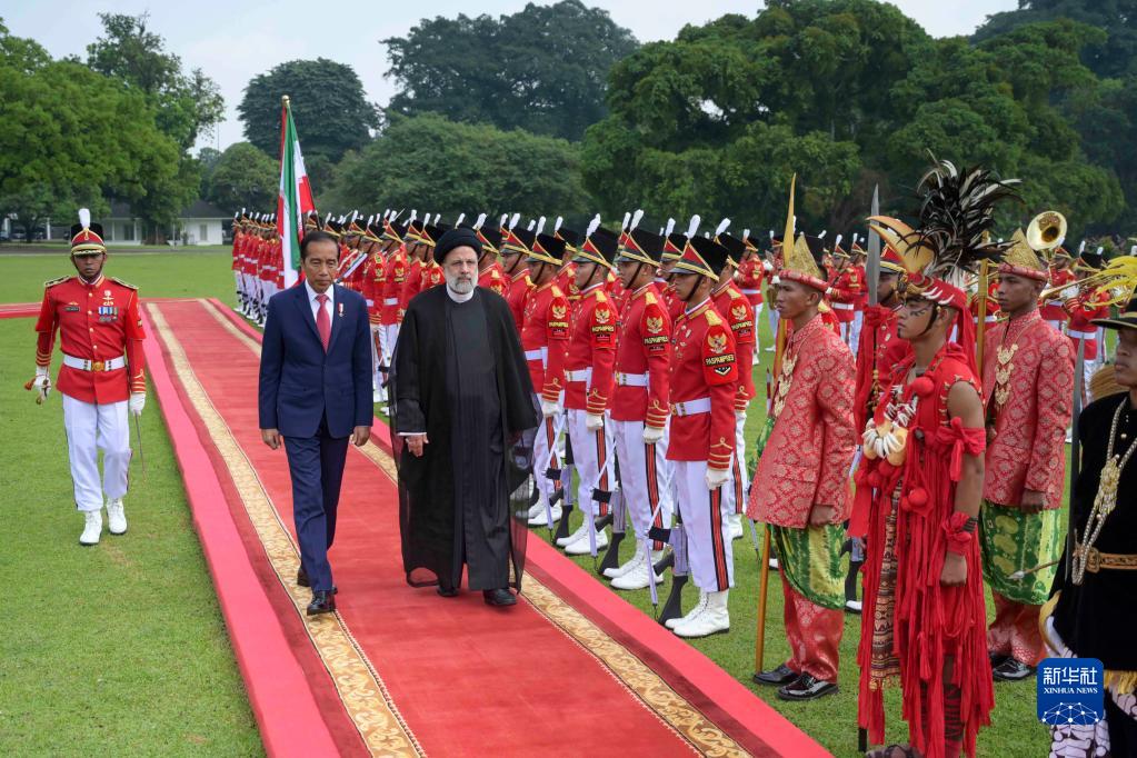 5月23日,在印度尼西亞茂物總統府,印尼總統佐科(中左)舉行儀式,歡迎到訪(fǎng)的伊朗總統易卜拉欣·萊希(中右)。