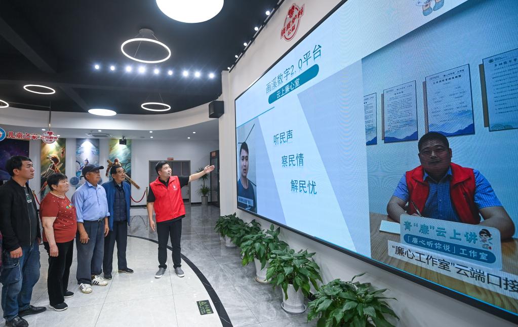 5月23日,在長(cháng)興縣畫(huà)溪街道姚家橋村文化禮堂,村民在了解廉心工作室線(xiàn)上受理問(wèn)題流程。