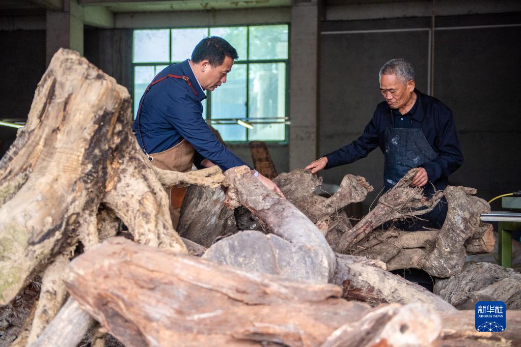5月23日,在洞口縣巖山鎮陽(yáng)家山村,傅立先(左)和父親傅金林在挑選木雕材料。