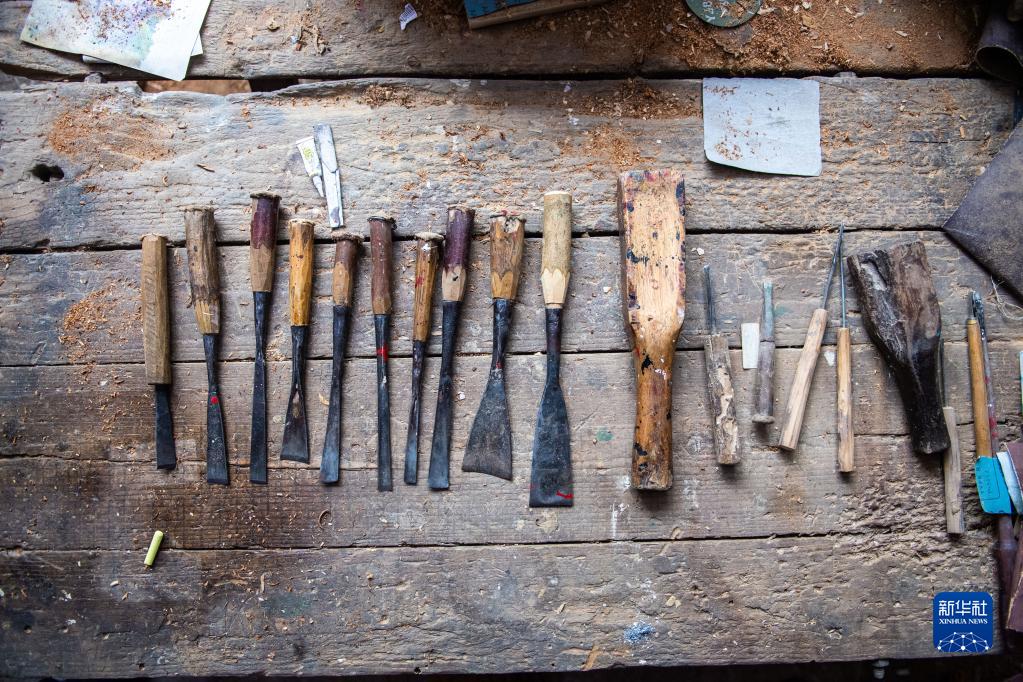 這是5月23日在洞口縣巖山鎮陽(yáng)家山村拍攝的制作洞口木雕的工具。