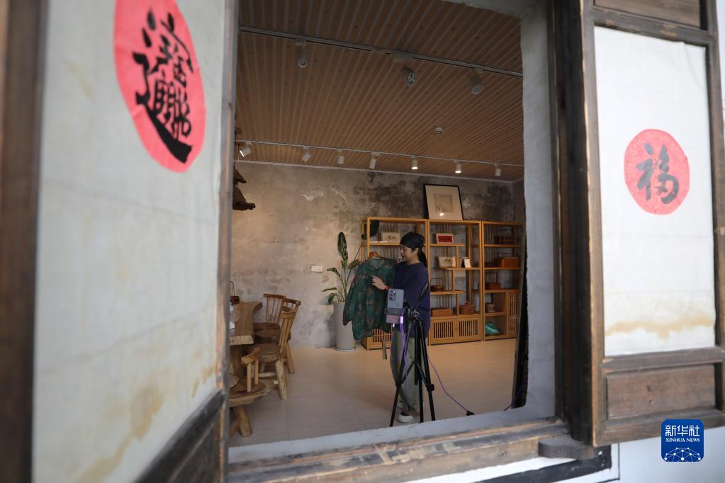 5月23日,在浙江省義烏市李祖村,創(chuàng )客鮑麗萍在店鋪里為網(wǎng)絡(luò )直播銷(xiāo)售做準備。